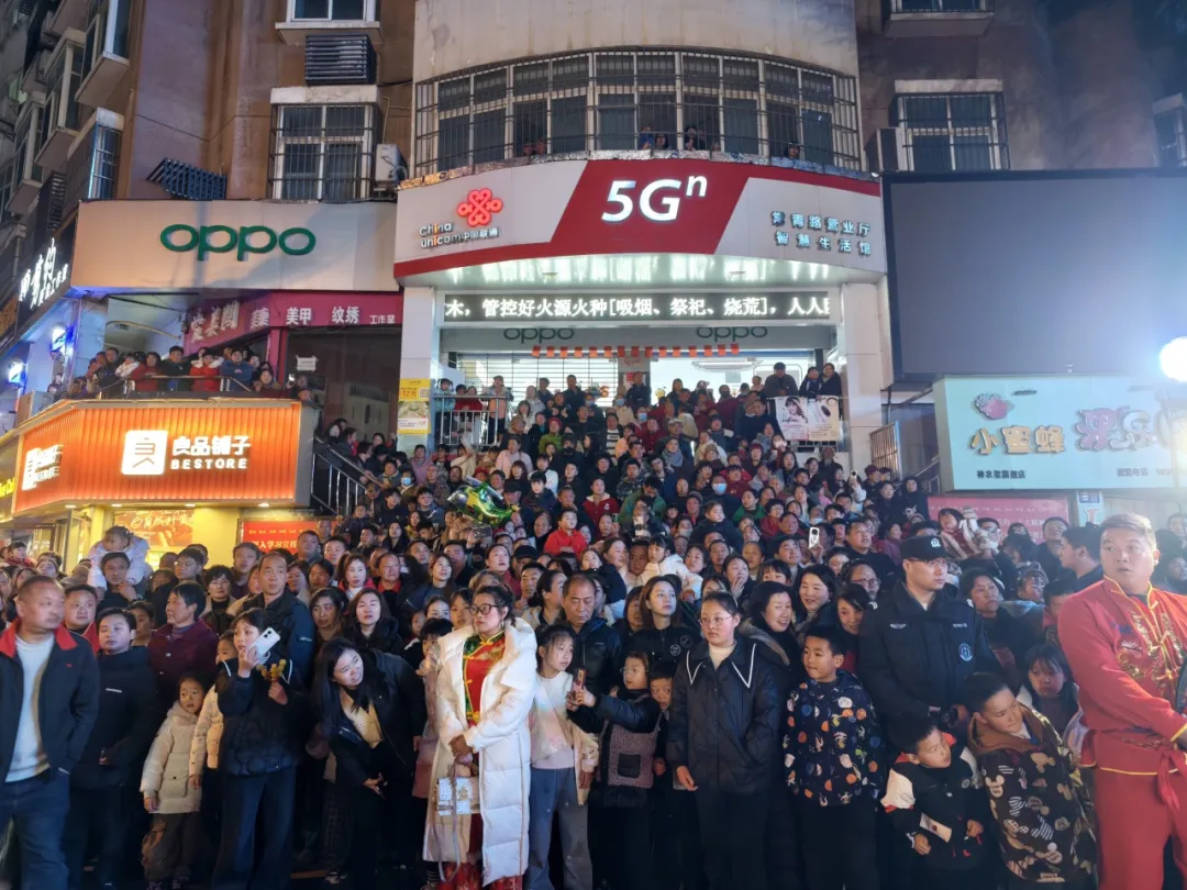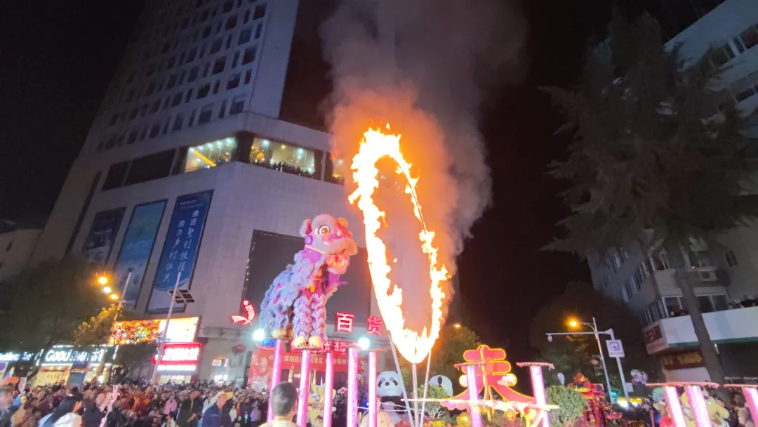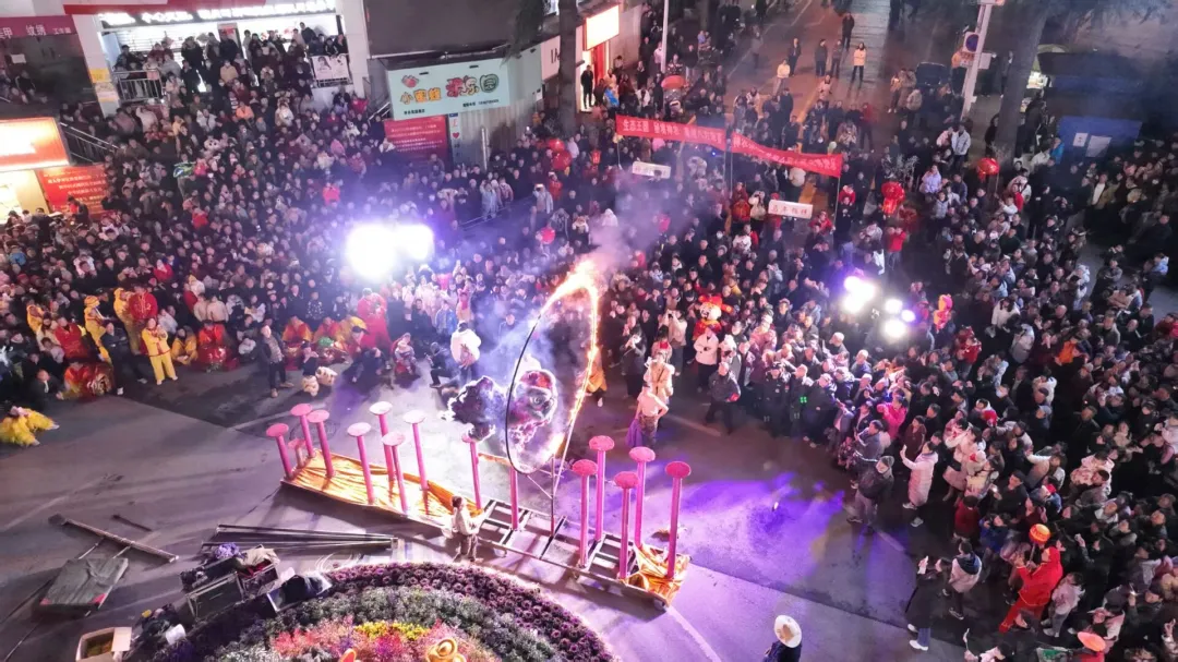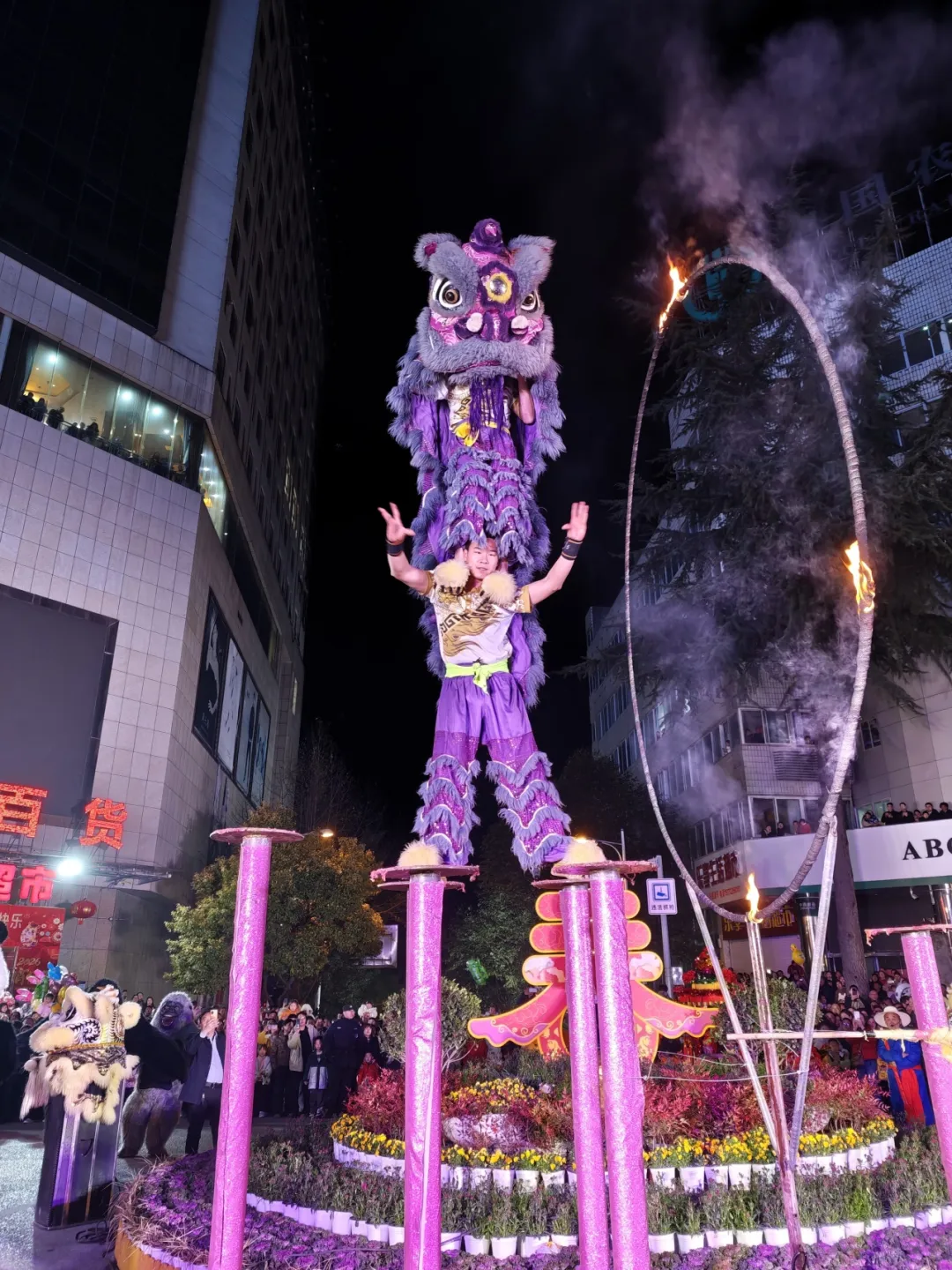 随着鼓点骤起,金龙腾空翻转,金狮跳跃腾挪,每一个高难度动作都引来阵阵惊呼与喝彩。孩子们骑在家长肩头挥舞着发光灯笼,年轻人举起手机记录精彩瞬间,老人们眼含笑意,连连称赞:“这才叫过年!热闹,喜庆!”