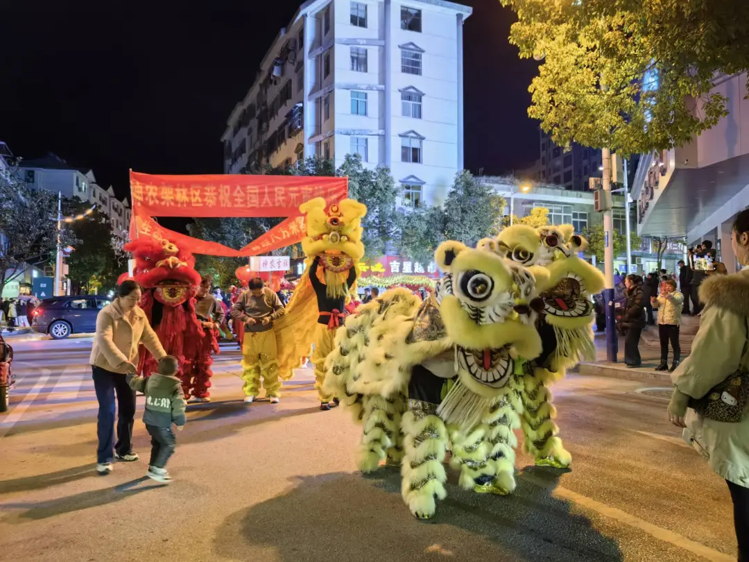 沿街商铺霓虹闪烁,居民楼上窗口都探出笑脸。龙狮队伍行进时,沿途不断有市民加入巡游队伍,自发跟着节奏鼓掌呐喊。相识的邻里互相招呼祝福,不认识的人们也因这场盛会相视而笑。
